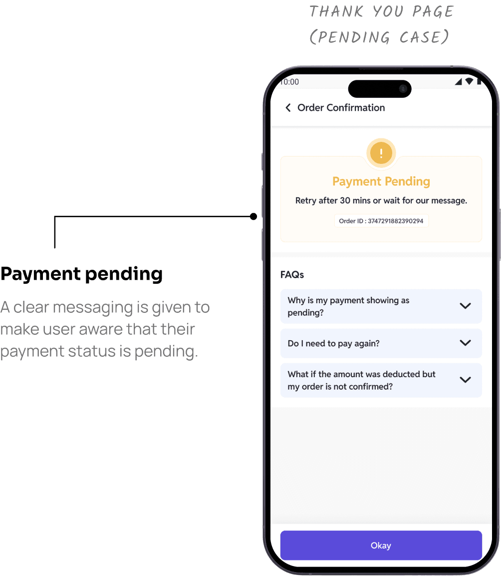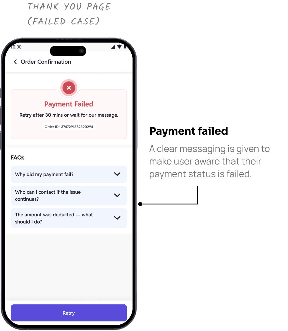 The order summary felt overwhelming, making it hard to distinguish main item from add-ons. At a moment where trust mattered most, payment details lacked reassurance hence leaving users feeling hesitant and unsure, leading to drop-offs, delayed purchases, or reliance on human support.