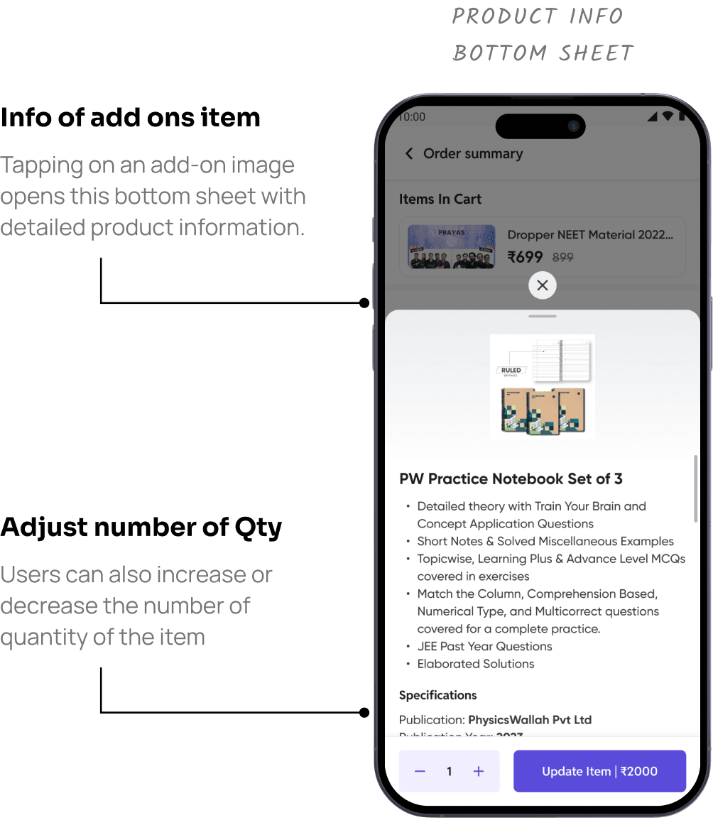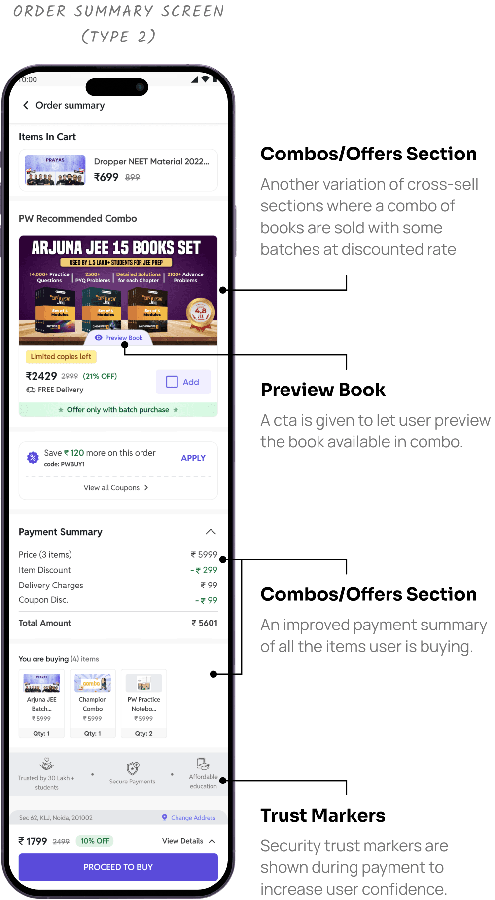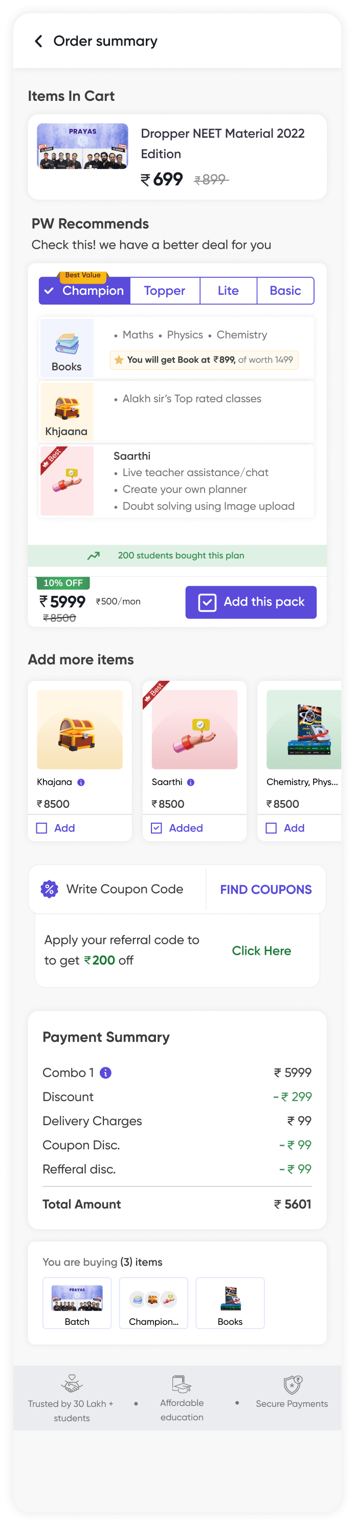 We redesigned the order summary and payment experience to bring clarity at the final decision point. The updated flow clearly separates essentials from optional add-ons, simplifies the price breakdown, and reinforces trust through transparent payment cues